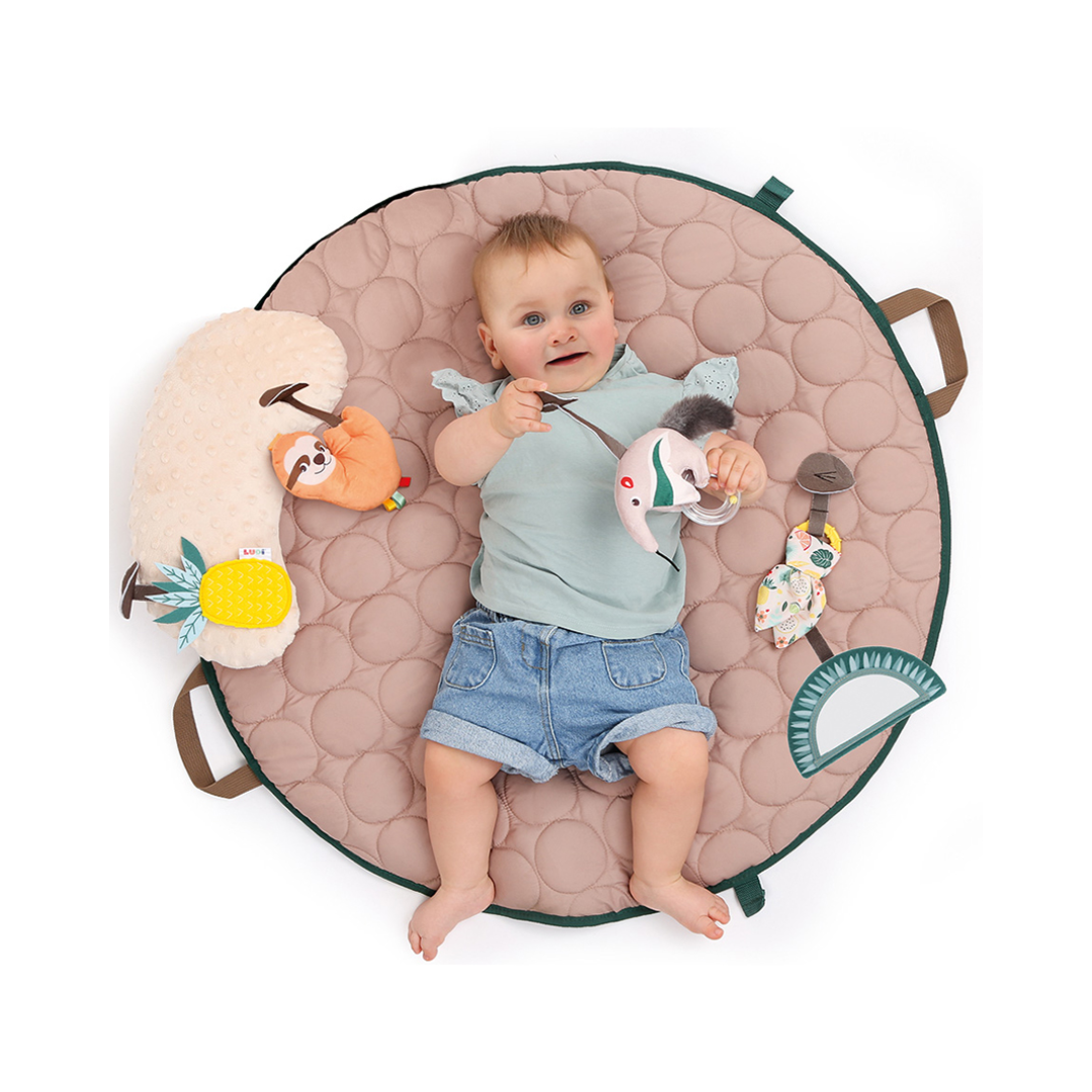 Cuando comienza a darse la vuelta y a gatear, la alfombra se transforma en un espacio ideal para la motricidad libre. Incluye un suave cojín abdominal, perfecto para fortalecer los músculos y explorar con total confort.