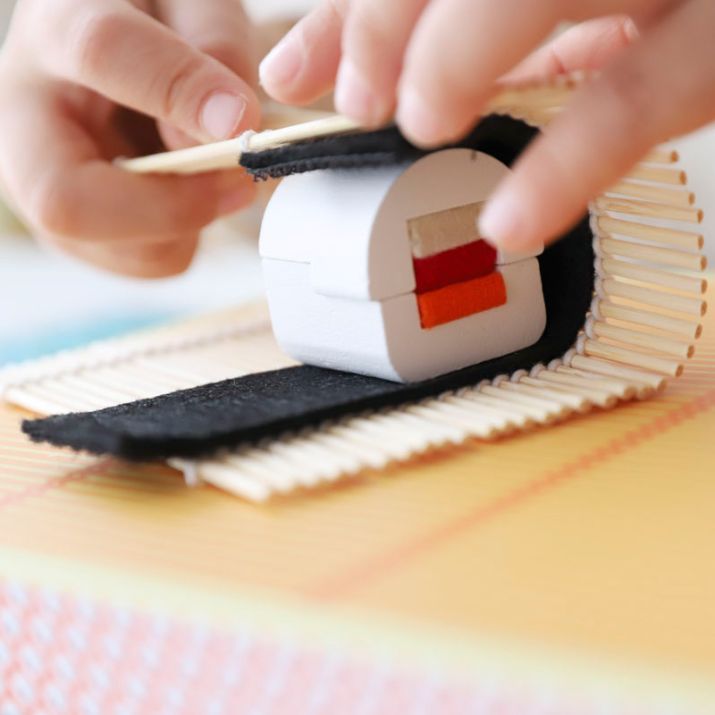 Este creativo set de juego permite a los más pequeños preparar divertidos rollitos de sushi utilizando materiales suaves y seguros. Los rollitos cuentan con una cubierta de madera que simula el arroz, mientras que el relleno se crea combinando piezas de fieltro de distintos colores, fomentando la imaginación y el juego simbólico.