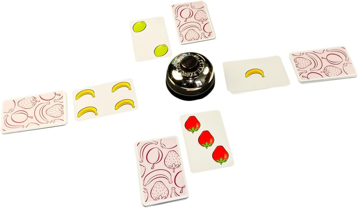 El objetivo es estar atento: en cuanto aparezcan exactamente cinco frutas del mismo tipo, ¡rápido al timbre! El jugador más rápido se llevará la mano.