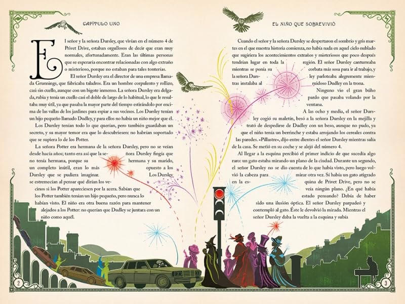 En esta edición especial de Harry Potter y la piedra filosofal, el texto completo e íntegro de la obra original de J.K. Rowling va acompañado por hermosas ilustraciones a todo color en casi todas las páginas, un diseño excelente y varias sorpresas interactivas de ingeniería en papel, obra del célebre estudio MinaLima.