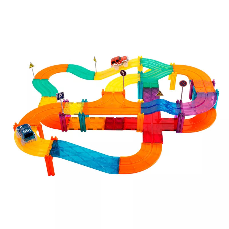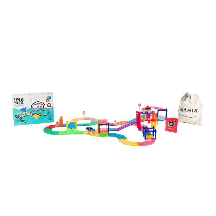 ¡La diversión sobre ruedas está asegurada! Con la Pista de Carreras Imanix, niñas y niños podrán construir emocionantes circuitos en 2D y 3D con sus propias manos, gracias a sus 50 piezas magnéticas de fácil encaje.