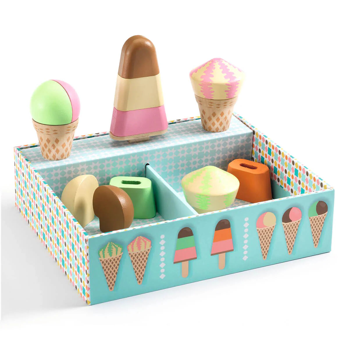 El set permite elegir entre diferentes opciones, como un cono de gofre con helado de chocolate y limón, un cono de vainilla y fresa o un polo de tres sabores. Las combinaciones estimulan la toma de decisiones y el juego libre.
