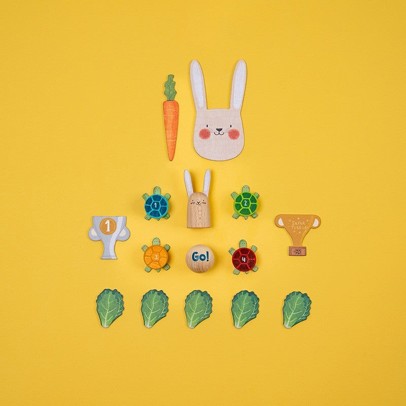 Un juego cooperativo muy divertido inspirado en la fábula de la liebre y la tortuga, a partir de 5 años. Juego sostenible hecho de cartón y madera.