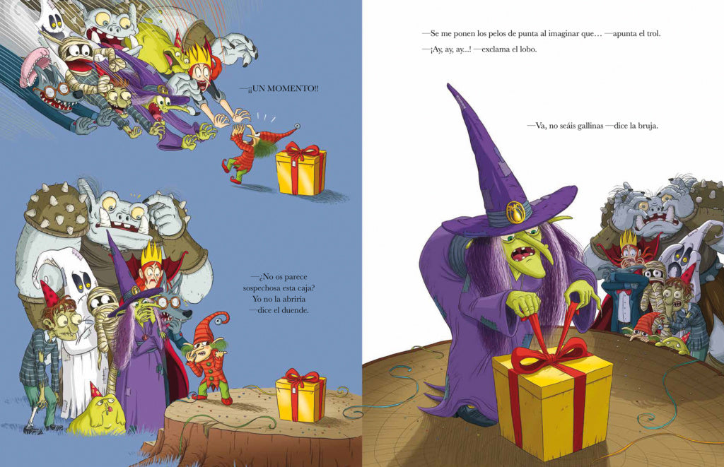 Es medianoche: ¡hora de abrir los regalos! Acompaña a la bruja, al trol y a los demás monstruos a abrir sus paquetes levantando las tapas: horno para niños, catapulta demolición… Juguetes al gusto de cada invitado.
