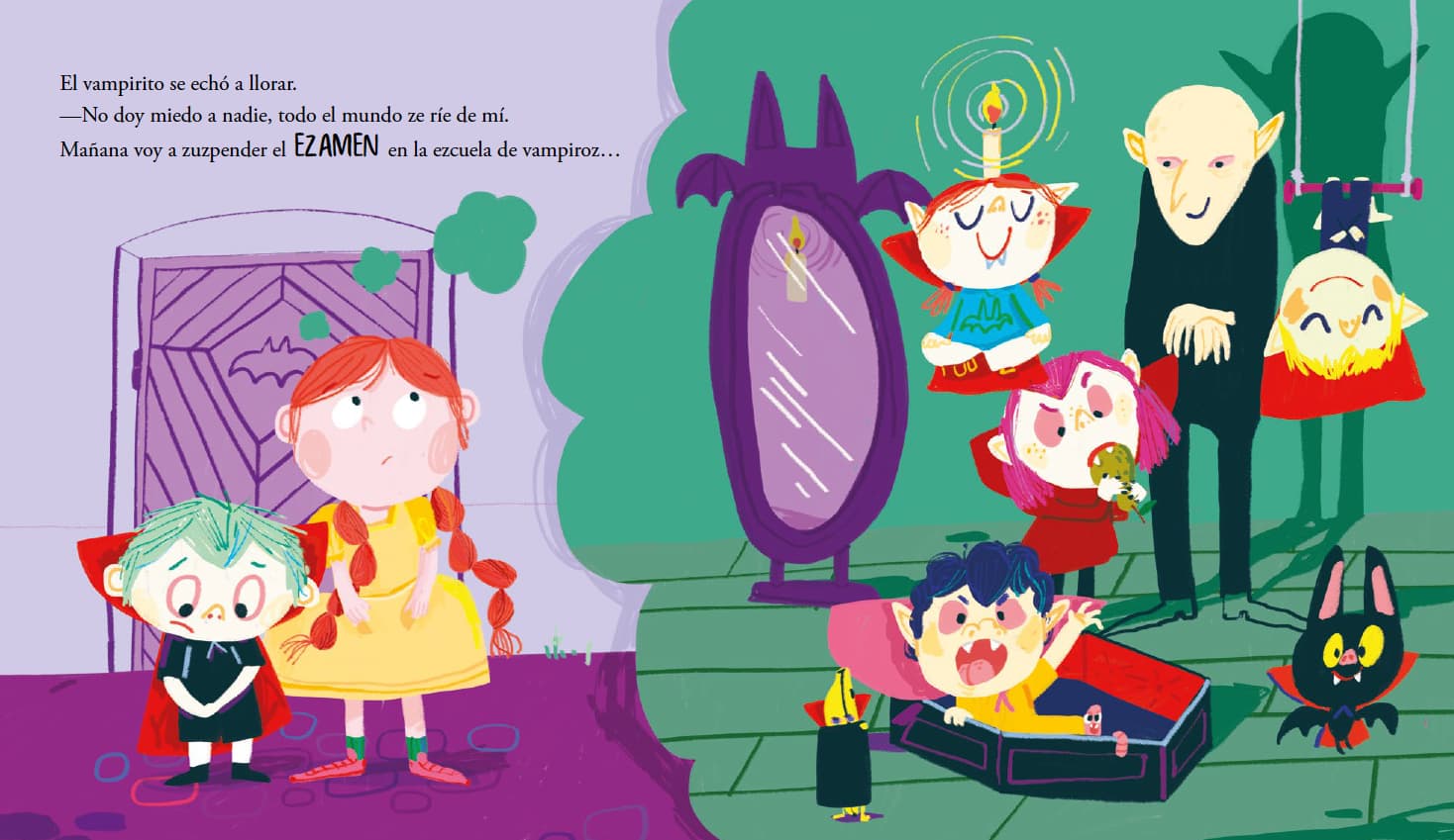 La niña tembló, pero de risa. Este vampirito no consigue dar un susto a nadie. A este pazo no podrá zuperar el examen de la ezcuela de vampiroz…